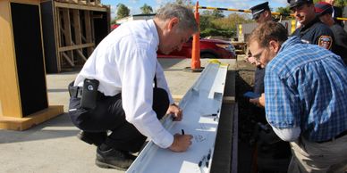 Craig Van Steenbergen Jr. watching as Assistant Chief/FRFS Director Chris Tracy signs beam at the topping off